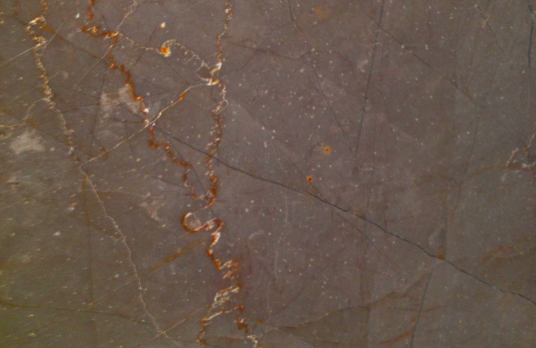 Mármore castanho de textura fina. Apresenta alguns traços de calcite branca, forte e bem definida.